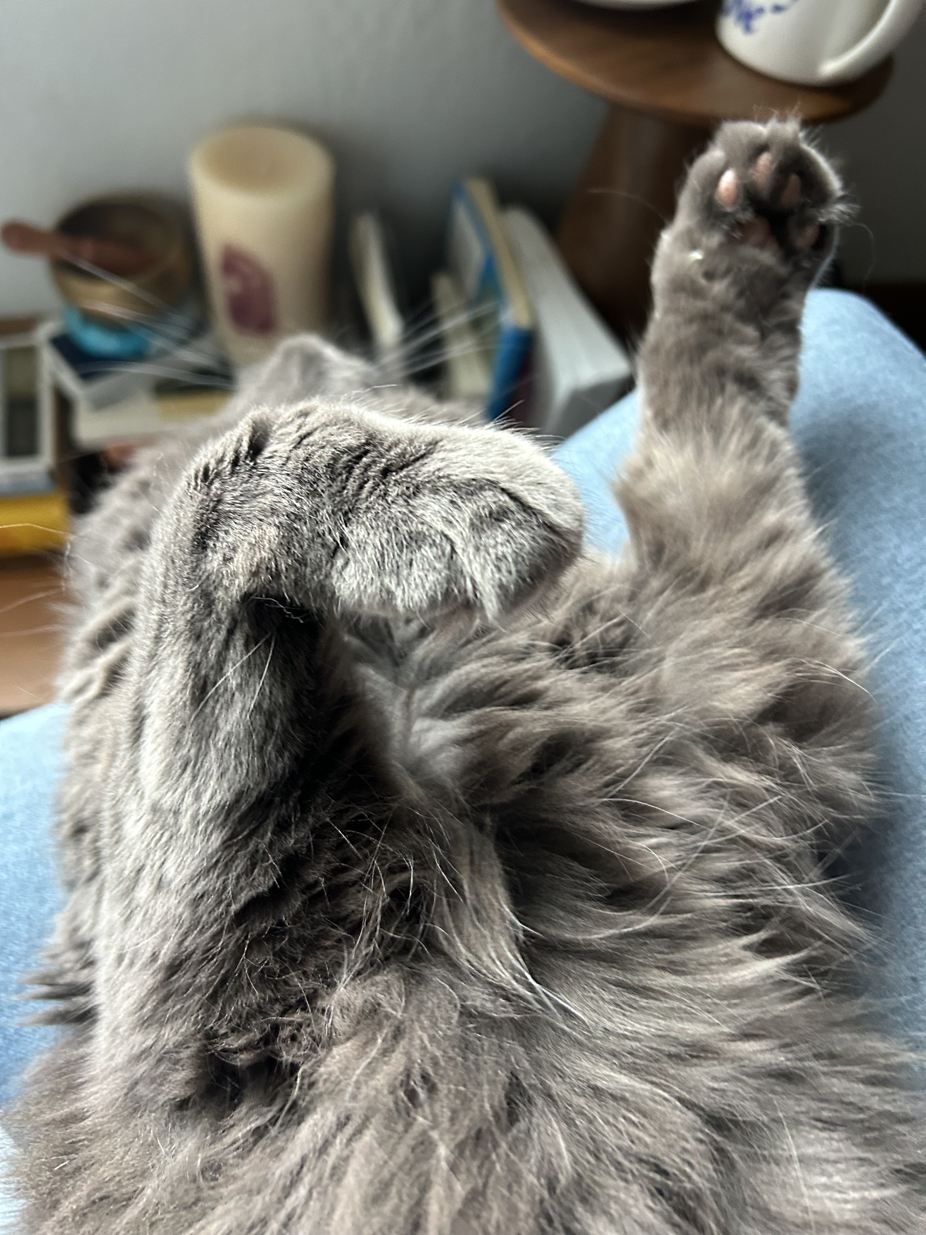 But an interesting thing happened when we brought her in: she just relaxed. There is no more furtive sneaking about the house, or rushing from hiding place to hiding place. She will come into a room and flop down in the middle of the floor to be nuzzled by the dog, or scooped up for petting. She rolls belly up to be loved, freedom to be vulnerable because she feels safe.