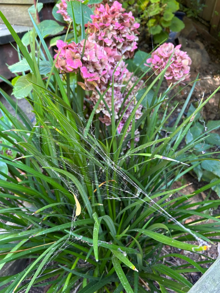 In the fall there is a different experience in the backyard garden and that is spider webs (and presumably spiders but you don’t see them so much). As I walk through the yard in the mornings I inevitably walk through webs that are unseen in the shadows, and while I don’t mind spiders at all, the feeling of the web across my face is unsettling.
